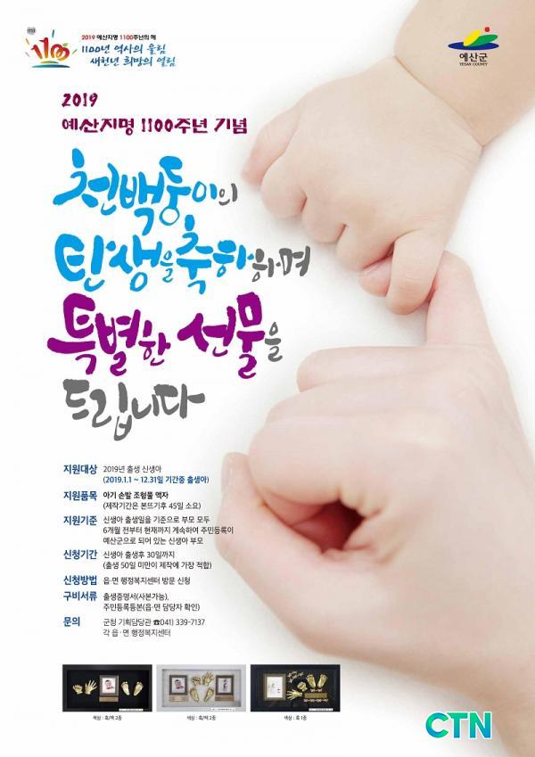 [¿¹»ê/ctn]ÃÖ¿ë°ü ±âÀÚ = ¿¹»ê±º(±º¼ö Ȳ¼±ºÀ)Àº ¿¹»êÁö¸í 1100ÁÖ³âÀÌ µÇ´Â ¿ª»çÀûÀÎ 2019³âÀ» ¸Â¾Æ 1100ÁÖ³âÀ» ±â³äÇϰí Ãâ»êÀ» µµ¸ðÇϰíÀÚ 2019³â Ãâ»ýÇÑ ½Å»ý¾Æ¸¦ ´ë»óÀ¸·Î ±â³äǰÀ» Á¦ÀÛÇØÁÖ´Â '2019 ź»ý õ¹éµÕÀÌ ÃàÇÏ Áö¿ø»ç¾÷'À» ½Ç½ÃÇÑ´Ù°í ¹àÇû´Ù.