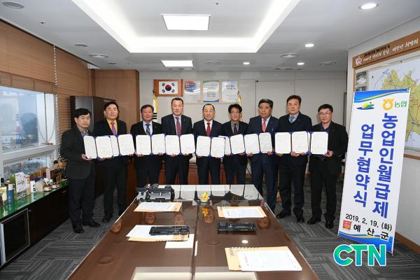[¿¹»ê/ctn]ÃÖ¿ë°ü ±âÀÚ = ¿¹»ê±ºÀÌ Áö³ 19ÀÏ ±ºÃ» ±º¼ö½Ç¿¡¼ ³óÇùÁß¾Óȸ¿¹»ê±ºÁöºÎÀå ¹× 7°³Áö¿ª³óÇùÁ¶ÇÕÀå°ú 2019³â ³ó¾÷ÀÎ ¿ù±ÞÁ¦ »ç¾÷ÃßÁøÀ» À§ÇÑ ¾÷¹«Çù¾àÀ» ü°áÇß´Ù.