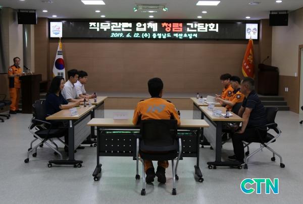 ¼Ò¹æ °ü·Ã¾÷ü °ü°èÀο¡°Ô ÇöÀåÀÇ ¸ñ¼Ò¸®¸¦ ûÃëÇÏ°í ¿¹»ê¼Ò¹æ¼ÀÇ Ã»·ÅÀÇÁö¸¦ ¾÷ü ´ëÇ¥ÀÚ¿¡°Ô Àü´ÞÇÏ¿© û·Å¹®È¸¦ ¼±µµÇϰíÀÚ ÇÔÀ̸ç, À̳¯ °£´ãȸ´Â Á÷¹«°ü·Ã¾÷ü 10¿© ¸íÀÌ Âü¼®Çß´Ù.