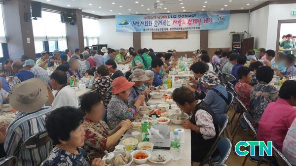 À̹ø Çà»ç¿¡ »ï°èÅÁ¿ë ´ßÀ» ÈÄ¿øÇÑ ºÀ»ê¸éÁö¿ª»çȸº¸ÀåÇùÀÇü ÀεÎÁø ¹Î°£À§¿øÀåÀº "Ãʺ¹À» ¸ÂÀÌÇØ ¾î¸£½ÅµéÀÌ ¸ÀÀÖ°Ô ½Ä»ç¸¦ ÇϽðí Áñ°Å¿î ½Ã°£À» º¸³»½Ã´Â ¸ð½ÀÀ» º¸¸é¼ Å« º¸¶÷À» ´À²¼´Ù"¸ç "¾ÕÀ¸·Îµµ ³ëÀΰø°æ È®»ê ¹× ¾î·Á¿î ÀÌ¿ôµé¿¡°Ô ¿ÂÁ¤ÀÇ ¼Õ±æÀÌ ´êÀ» ¼ö Àִ Ȱµ¿À» ²ÙÁØÈ÷ ÇØ ³ª°¡°Ú´Ù"°í ¹àÇû´Ù.