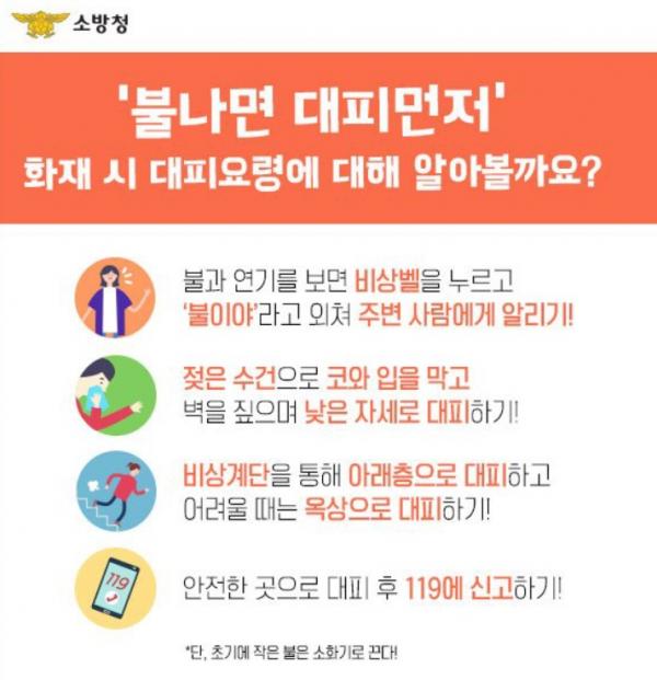 À¯¹®Á¾ ¿¹¹æ±³À°ÆÀÀåÀº "ºÒ³ª¸é ´ëÇǸÕÀúÀÓÀ» ±â¾ïÇϰí, ÈÀç ½Ã ´ëÇÇ¿ä·ÉÀ» ¼÷ÁöÇÏ¿© ¾ÈÀü»ç°í¿¡ À¯ÀÇÇØÁÖ±æ ¹Ù¶ó¸ç, Æò¼Ò ¾ÈÀüÀ» »ýȰÈÇÏ´Â ½À°üÀ» °®±â ¹Ù¶õ´Ù"°í ÀüÇß´Ù.