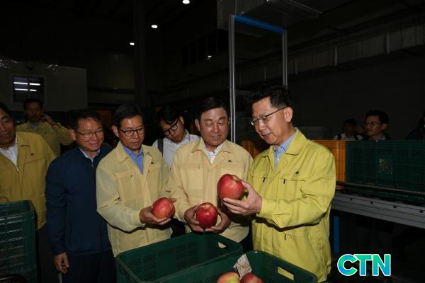 | <Ȳ¼±ºÀ ±º¼ö(»çÁø °¡¿îµ¥)¿Í ±èÇö¼ö Àå°ü(¿À¸¥ÂÊ)ÀÌ ¿¹»ê´É±Ý³óÇù ³ó»ê¹°À¯Åë¼¾ÅÍ¿¡¼ »ç°ú¸¦ »ìÆìº¸°í ÀÖ´Ù.> |