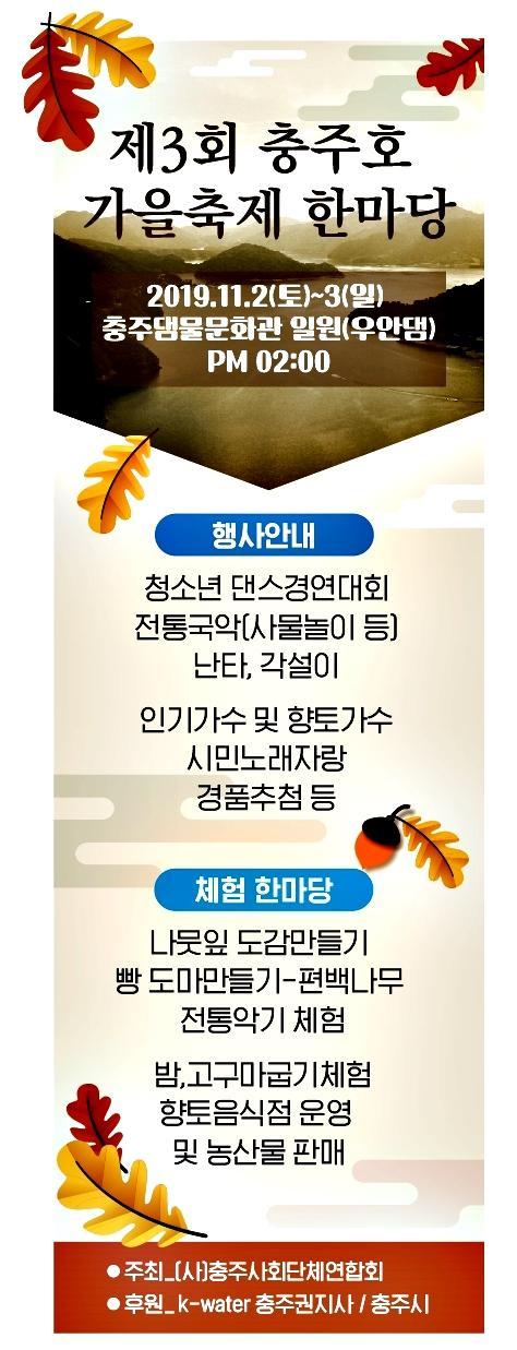 À̹ø °¡À»ÃàÁ¦ ÇѸ¶´ç Çà»ç´Â K-waterÃæÁÖ±ÇÁö»ç(Áö»çÀå ¹®°æÈÆ)ÀÇ ÈÄ¿øÀ¸·Î ÁøÇàµÇ¸ç, ÀÚ¿¬Ä£ÈÀûÀÎ ÃæÁÖ´ïÀ» È«º¸Çϰí ÃæÁÖÈ£ÀÇ ¼ö·ÁÇÑ ÀÚ¿¬È¯°æÀ» ³Î¸® ¾Ë·Á °ü±¤°´ Áõ°¡¿Í Áö¿ª¹®È ¹ßÀüÀ» À¯µµÇϱâ À§ÇØ ¸¶·ÃµÆ´Ù.