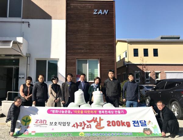 [ÃæÁÖ/ctn]¹Úö¿ì ±âÀÚ= Á÷¡¤°øÀå»õ¸¶À»¿îµ¿ÃæÁÖ½ÃÇùÀÇȸ(ȸÀå ±è¿øÁß)´Â 14ÀÏ ¸ñ¿äÀÏ È¸¿ø 20¸íÀÌ Âü¿©ÇÏ¿© "»çȸº¹Áö¹ýÀÎ ¼þ´ö¿ø Àå¾ÖÀÎ º¸È£ÀÛ¾÷Àå ZAN"À» ã¾Æ Æòȳª´®¿îµ¿À¸·Î µû¶æÇÑ °Ü¿ïÀ» ³¯ ¼ö ÀÖµµ·Ï »ç¶ûÀÇ ½Ò(200kg)À» Àü´ÞÇÏ°í ºÀ»çȰµ¿À» Àü°³Çß´Ù.