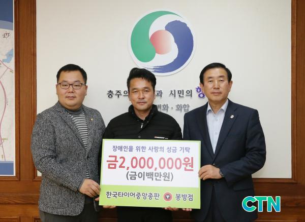 [ÃæÁÖ/ctn]¹Úö¿ì ±âÀÚ= ÃæÁÖ Çѱ¹Å¸À̾îÁß¾ÓÃÑÆÇ Æ¼-½ºÅ×ÀÌ¼Ç ºÀ¹æÁ¡(´ëÇ¥ À̱æ¼ö)Àº 2ÀÏ ÃæÁÖ½ÃûÀ» ¹æ¹®ÇÏ¿© Çѱ¹Àå¾ÖÀκθðÈ¸ÃæÁÖ½ÃÁöºÎ¿¡ ¼º±Ý 200¸¸¿øÀ» ±âŹÇß´Ù.