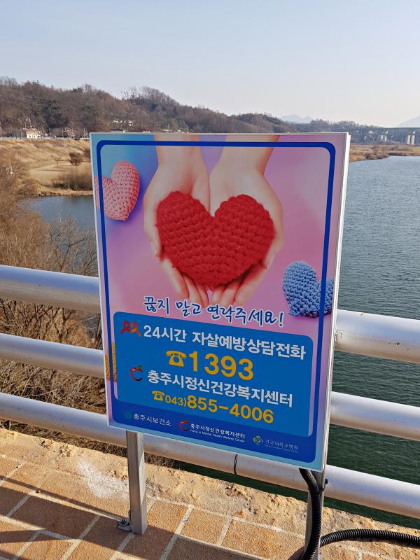 ¶ÇÇÑ Àڻ쿡 ´ëÇÑ °æ°¢½É °íÃë ¹× »ý¸íÁ¸Áß ¹®ÈÁ¶¼ºÀ» À§ÇØ LED¸¦ ÀÌ¿ëÇÑ ¹àÀº ´À³¦ÀÇ Àڻ쿹¹æ¾È³»ÆÇÀÌ ¼³Ä¡µÅ ÀÖÀ¸¸ç, 'Àڻ쿹¹æ»ó´ãÀüÈ 1393¹ø' °ú 'ÃæÁÖ½ÃÁ¤½Å°Ç°º¹Áö¼¾ÅÍ 043)855-4006' ¹®±¸°¡ ÀûÇôÀÖ¾î ¹Ù·Î µµ¿òÀ» ¹ÞÀ» ¼ö ÀÖµµ·Ï Çß´Ù.