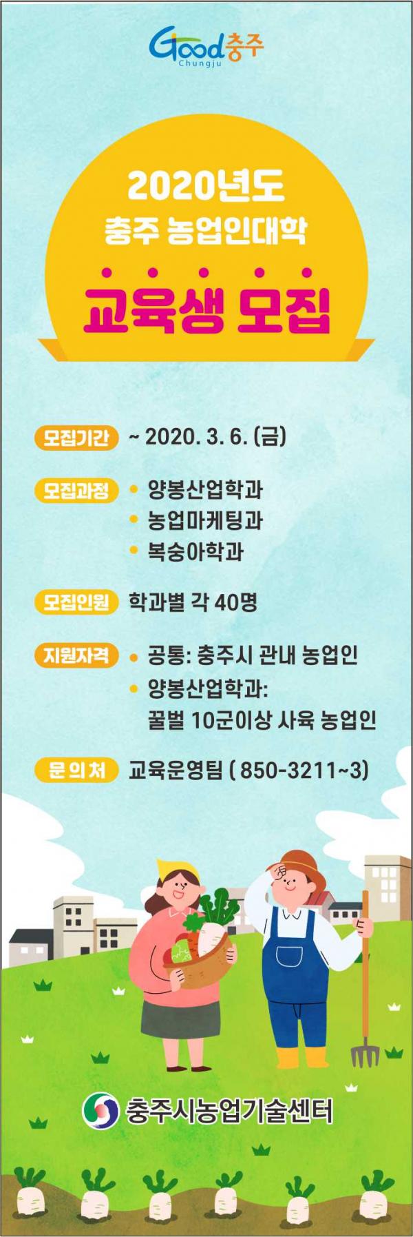 [ÃæÁÖ/ctn]¹Úö¿ì ±âÀÚ= ÃæÁֽóó¾÷±â¼ú¼¾ÅÍ(¼ÒÀå Á¤Áø¿µ)´Â Áö¿ª³ó¾÷ÀÇ Æ¯È¹ßÀü¿¡ ÇÊ¿äÇÑ ±â¼ú±³À°À¸·Î Àü¹® ³ó¾÷°æ¿µÀÎÀ» ¾ç¼ºÇϱâ À§ÇØ '³ó¾÷ÀδëÇÐ 8±â ±³À°»ý' À» ¸ðÁýÇÑ´Ù°í ¹àÇû´Ù.