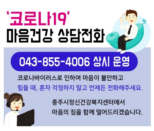 [ÃæÁÖ/CTN] ¹Úö¿ì ±âÀÚ = ÃæÁֽô Áö¿ª ³» Äڷγª 19·Î ÀÎÇØ È®ÁøÀÚ°¡ ¹ß»ýÇÔ¿¡ µû¶ó ½Ã¹ÎµéÀÌ °Þ°Ô µÇ´Â °©ÀÛ½º·¯¿î ½ºÆ®·¹½º¿Í ¸·¿¬ÇÑ ºÒ¾È°¨À» ´ú¾îÁÖ°íÀÚ '¸¶À½°Ç° »ó´ãÀüÈ(¢Î855-4006)' ¸¦ »ó½Ã ¿î¿µÇÑ´Ù°í ¹àÇû´Ù.