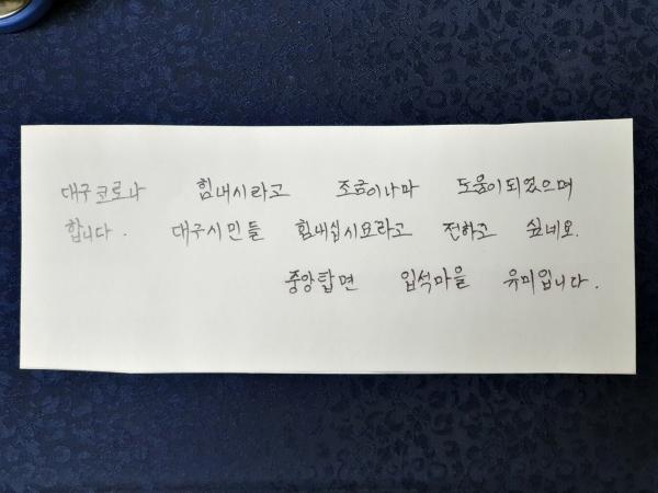 Áö³ 5ÀÏ¿¡´Â À͸íÀÇ ±âºÎÀÚ°¡ Äڷγª19 ±Øº¹À» À§ÇØ ÃæÁֽùÎÀ» µ½´Â ±â±ÝÀ¸·Î Àü´ÞÇØ ´Þ¶ó¸ç 20¸¸ ¿øÀ» ±âŹÇßÀ¸¸ç, Áß¾Óž¸é ÀÔ¼®¸¶À» À¯¹Ì¾¾´Â Äڷγª·Î Èûµé¾î ÇÏ´Â ´ë±¸½Ã¹ÎÀ» ÀÀ¿øÇÏ´Â ÆíÁö¿Í ÇÔ²² Çö±Ý 30¸¸ ¿øÀ» µ¿ºÀÇØ ¿Ô´Ù.