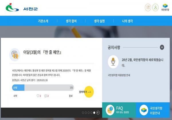 Âü¿©¹æ¹ýÀº ÀÎÅÍ³Ý ±¹¹Î»ý°¢ÇÔ(https://www.epeople.go.kr/idea/seocheon)¿¡ Á¢¼ÓÇØ ȸ¿ø°¡ÀÔ ÈÄ 'ÀÌ´ÞÀÇ ÇÑ ÁÙ Á¦¾È'¿¡ ´ñ±ÛÀ» ´Þ¸é µÈ´Ù.