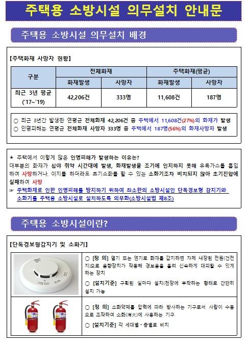 ¹ß¼ÛÇÑ ¾È³»¹®¿¡´Â ¡ãÁÖÅÃ¿ë ¼Ò¹æ½Ã¼³ÀÇ Á߿伺 ¡ãÁÖÅÃ¿ë ¼Ò¹æ½Ã¼³ÀÇ Àǹ«¼³Ä¡ ¹è°æ ¡ã¿¹»ê¼Ò¹æ¼¿Í ¿¹»ê±ºÀÌ ÇÕµ¿À¸·Î ÃßÁøÇÏ´Â ´Üµ¶°æº¸Çü °¨Áö±â ¼³Ä¡ ¾È³» µîÀÌ Æ÷ÇԵƴÙ.