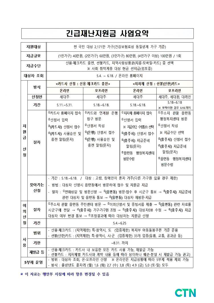 [ÃæÁÖ/CTN] ¹Úö¿ì ±âÀÚ = ÃæÁֽô Áö³ 4¿ù 29ÀÏ ±¹È¸ º»È¸ÀÇ¿¡¼ Äڷγª19 ¡¸±ä±ÞÀç³Áö¿ø±Ý¡¹Áö±Þ Ãß°¡°æÁ¤¿¹»êÀÌ Åë°úµÊ¿¡ µû¶ó 5¿ù 4ÀϺÎÅÍ ±ä±ÞÀç³Áö¿ø±ÝÀ» ¼øÂ÷ÀûÁö±ÞÀ» ½ÃÀÛÇÑ´Ù°í ¹àÇû´Ù.