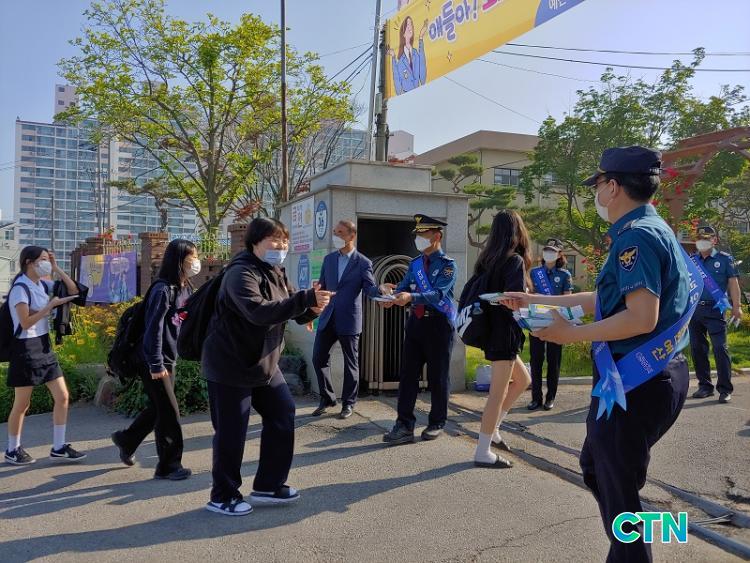 À̳¯ ¿©¼ºÃ»¼Ò³â°è ¼Ò¼Ó °æÂû°üµéÀÌ ¸¶½ºÅ©¸¦ Âø¿ëÇÏ°í µî±³ÇÏ´Â 2¡¤3Çгâ Çлýµé¿¡°Ô ºÒ¹ýÃÔ¿µ ¹× ºÒ¹ýÃÔ¿µ¹° À¯Æ÷¡¤À¯Æ÷Çù¹Ú¡¤ÀúÀ塤Àü½Ã µî »çÀ̹ö °ø°£¿¡¼ ÀϾ´Â ¼ºÆø·Â¿¡ ´ëÇÑ ¼³¸í°ú ÇÔ²² È«º¸¹°(¼Õ¼Òµ¶Á¦)À» ¹èºÎÇϸç ÇлýµéÀÇ µî±³¸¦ ¸ÂÀÌÇß´Ù.