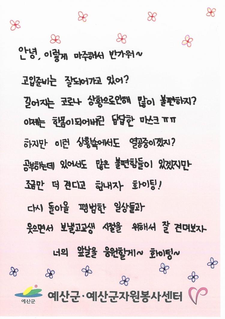 Á¤³«±Ô ¼¾ÅÍÀåÀº "Áß3 ÇлýµéÀÌ ¾î·Á¿î ½Ã±â¸¦ Àß ±Øº¹ÇØ ²ÞÀ» ÆîÄ¡±æ ¹Ù¶ó´Â ¸¶À½À¸·Î ÀÚ¿øºÀ»çÀÚµéÀÌ ÆíÁö¸¦ ¾²°í ÀÀ¿øÅ°Æ®¸¦ ¸¸µé¾ú´Ù"¸ç "¾ÕÀ¸·Îµµ ¿ì¸® ¼¾ÅÍ´Â ¹è·Á¿Í ³ª´®ÀÇ ÀÚ¿øºÀ»çȰµ¿À» ÅëÇØ Äڷγª19¸¦ ±Øº¹ÇÒ ¼ö ÀÖµµ·Ï ½É¸®Àû ¹æ¿ª¿¡µµ ÃÖ¼±À» ´ÙÇϰڴÙ"°í ¸»Çß´Ù.
