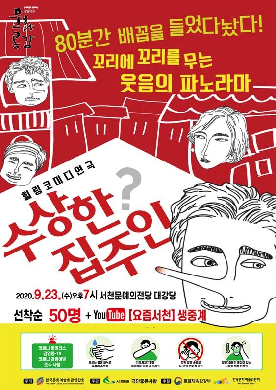 '2020³â ¹®¿¹È¸°ü°ú ÇÔ²²ÇÏ´Â ¹æ¹æ°î°î ¹®È°ø°¨»ç¾÷'¿¡¼ ¹Î°£¿¹¼ú´Üü ¿ì¼ö °ø¿¬ ÇÁ·Î±×·¥À¸·Î ¼±Á¤µÈ ¸®¾ó Äڹ̵𠿬±Ø '¼ö»óÇÑ ÁýÁÖÀÎ'À» ¿À´Â 23ÀÏ Àú³á 7½Ã ¼Ãµ ¹®¿¹ÀÇ Àü´ç°ú ¿Â¶óÀÎÀ» ÅëÇØ ¼±º¸ÀÏ ¿¹Á¤ÀÌ´Ù.