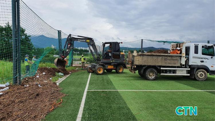 ±ºÀº Áö³´Þ ¼öÇØ·Î °¹°¿¡ ¸¹Àº ¾²·¹±â°¡ ¶°³»·Á ¿À´Â µî ¾î·Á¿òÀ» °Þ¾úÀ¸³ª ÀÚ¿øºÀ»çÀÚ¿Í ±ºÃ» Á÷¿øµéÀÇ ³ë·ÂÀ¸·Î ½Å¼ÓÈ÷ º¹±¸ ÀÛ¾÷À» ¸¶ÃÆ´Ù.