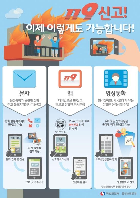 ¸ÕÀú,¿µ»óÅëÈ ½Å°íÀÇ °æ¿ì 119¸¦ ´©¸£°í ¿µ»óÅëȸ¦ ¿¬°áÇϸé 119»óȲ½Ç·Î ¿¬°áµÈ´Ù. ÀÇ»ç¼ÒÅëÀÌ ¾î·Á¿î ¿Ü±¹ÀÎÀ̳ª û°¢Àå¾ÖÀεµ ¼ÕÁþÀ̳ª ¼öÈ, ¸Þ¸ð¸¦ÅëÇØ ½Å°íÇÒ ¼ö ÀÖ´Ù.¶ÇÇÑ,¹®ÀÚ ½Å°í´Â ÅëȰ¡ ¾î·Á¿î »óȲ¿¡ 119 ¹øÈ£·Î ¹®ÀÚ ÀÔ·Â ÈÄ Àü¼ÛÇÏ¸é ½Å°í°¡ Á¢¼öµÇ¸ç, »çÁø°ú µ¿¿µ»ó ÷ºÎµµ °¡´ÉÇÏ´Ù.
