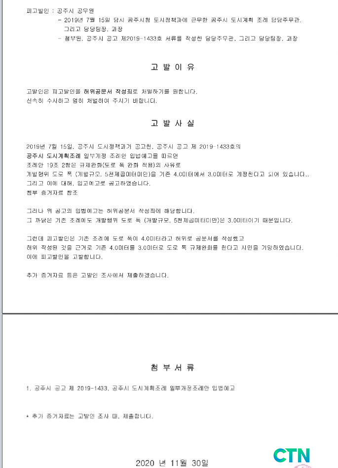 고발장의 피고발인은 2019년 7월 15일 당시 공주시청 도시정책과에 근무한 첨부(사진)된 공주시 공고 제2019-1433호 서류를 작성한 담당 주무관, 담당 팀장과 과장이다.