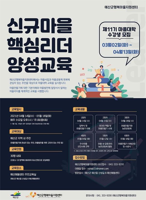 [¿¹»ê/CTN]ÃÖ¿ë°ü ±âÀÚ = ¿¹»ê±º ¸¶À»¸¸µé±â Áß°£Áö¿øÁ¶Á÷ÀÎ ¿¹»ê±ºÇູ¸¶À»Áö¿ø¼¾ÅÍ´Â ¸¶À»¸¸µé±â¿Í °øµ¿Ã¼ Ȱµ¿¿¡ ´ëÇÑ Á߿伺À» ÀνÄÇÏ°í ¸¶À»¸¸µé±â¸¦ À̲ø¾î °¥ ½Å±Ô ¸¶À»¸®´õ¸¦ ¾ç¼ºÇÏ´Â ÇÁ·Î±×·¥ÀÎ 'Á¦11±â ¸¶À»´ëÇÐ' ¼ö°»ýÀ» ¸ðÁýÇÑ´Ù.