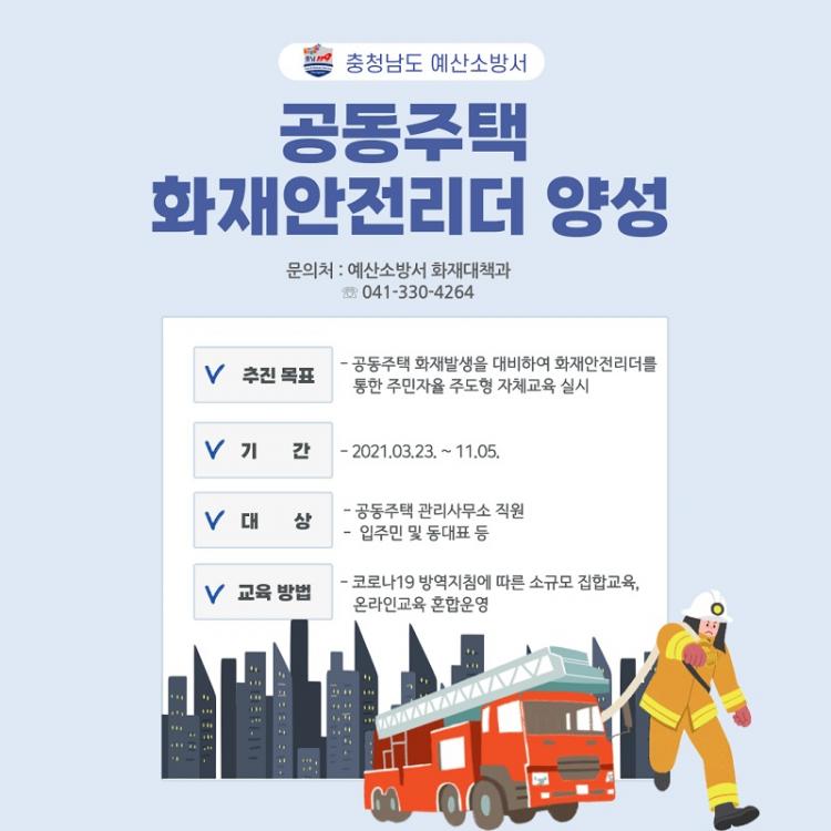 ÀÌ¿¡ ¿¹»ê¼Ò¹æ¼´Â ¿¹»ê±º °ü³» 48°³¼ÒÀÇ °øµ¿ÁÖÅà ¾ÆÆÄÆ® °ü¸®»ç¹«¼Ò °ü°èÀÚ, ÀÔÁÖÀÚ ´ëÇ¥ µîÀ» ´ë»óÀ¸·Î °øµ¿ÁÖÅà ÈÀç¾ÈÀü¸Å´º¾óÀ» ¹èºÎÇϰí, Äڷγª19 ¼Ò°½Ã ÁýÇÕ±³À°À» ½Ç½ÃÇÏ´Â µî Ãʱâ ÀÚÀ² ´ëó ¿ª·® °È¸¦ À§ÇØ °øµ¿ÁÖÅà ÈÀç¾ÈÀü¸®´õ ¾ç¼º±³À°À» ½Ç½ÃÇÑ´Ù.