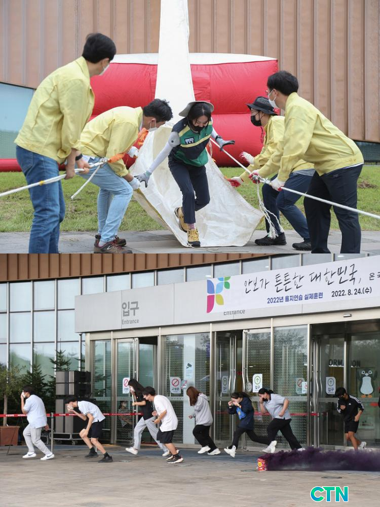 ÈÆ·ÃÀº 2022³â À»Áö¿¬½À ½ÇÁ¦ÈÆ·Ã °èȹ¿¡ ±Ù°ÅÇÑ Å×·¯´ëÀÀ ¹× ÈÀç ´ëÇÇÈÆ·ÃÀ¸·Î¼, ¹Î¡¤°ü¡¤±º¡¤°æ, ¼Ò¹æ ¹× À¯°ü±â°üÀÇ À§±â ´ëÀÀ ´É·ÂÀ» ³ôÀÌ°í ½Ã¹ÎÀÇ »ý¸í°ú Àç»êÀ» º¸È£ÇØ ÇÇÇØ¸¦ ÃÖ¼ÒÈÇϰíÀÚ ÃßÁøµÆ´Ù.À̳¯ ÈÆ·ÃÀº ¿ÀÈÄ 3½Ã ±¹¸³»ýÅ¿ø¿¡ ÆøÅº Å×·¯°¡ ¹ß»ýÇØ ¿¡ÄÚ¸®¿ò °Ç¹° ÀϺΰ¡ ÆÄ¼ÕµÇ°í ´ëÇü ÈÀç°¡ ¹ß»ý, È¿° ¹× À¯µ¶°¡½º·Î ÀÎÇÑ »ç»óÀÚ°¡ ¹ß»ýÇÑ »óȲÀ» °¡Á¤ÇßÀ¸¸ç, Å×·¯ ¹× ÈÀç Áø¾Ð-ÀÎ¸í±¸Á¶-ÇöÀåÁöÈÖ¼Ò¿Í ÅëÇÕÁö¿øº»ºÎ ¼³Ä¡-±ä±Þ ±¸È£È°µ¿-ÀÀ±Þº¹±¸ ¼øÀ¸·Î ÁøÇàµÆ´Ù.
