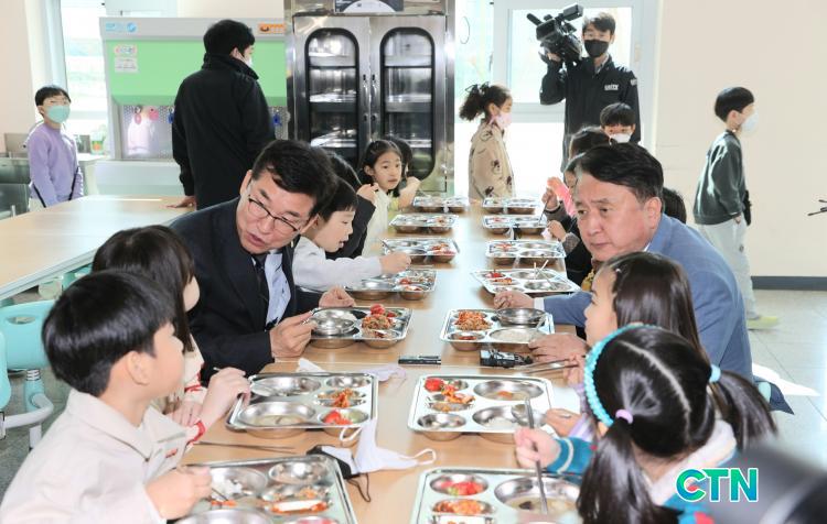 À±°Ç¿µ±³À°°¨(ÁÂÃø), ±è¿µÈ¯ µµÁö»ç(¿ìÃø), ³ª¶õÈ÷ Çб³±Þ½Ä ÇöÀå ã¾Æ ¾î¸°À̵é°ú ½Ä»ç¸¦ ÇϰíÀÖ´Ù.(12.11) / »çÁøÁ¦°ø=ÃæºÏ±³À°Ã»