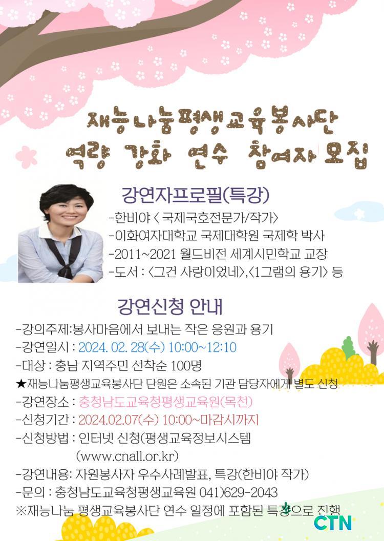 [±³À°/CTN]°Çö¼ö ±âÀÚ = ÃæÃ»³²µµ±³À°Ã»Æò»ý±³À°¿ø(¿øÀå ¼µ¿Ã¶)Àº 2.28(¼ö) 10:00~12:10¿¡ 2024³â Àç´É³ª´® Æò»ý±³À°ºÀ»ç´Ü ¿ª·®°È ¿¬¼öÀÇ ÀÏȯÀ¸·Î ÇѺñ¾ß ÀÛ°¡ Ư°À» ¿î¿µÇÑ´Ù.