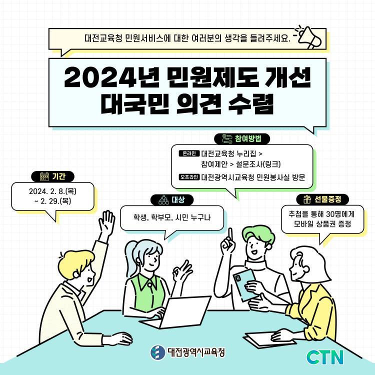 [´ëÀü/CTN]Á¤¹ÎÁØ ±âÀÚ¤Ó´ëÀü±¤¿ª½Ã±³À°Ã»(±³À°°¨ ¼³µ¿È£)Àº ±¹¹ÎÀÇ ÀǰßÀÌ ¹Ý¿µµÈ ½ÃÃ¥À» ¹ß±¼ÇÏ¿© ¼ö¿äÀÚ Áß½ÉÀÇ ¸ÂÃãÇü ¹Î¿ø¼ºñ½º¸¦ Á¦°øÇϱâ À§ÇØ, 2¿ù 8ÀÏ(¸ñ)ºÎÅÍ 29ÀÏ(¸ñ)±îÁö 3ÁÖ°£ ¹Î¿ø Á¦µµ°³¼± Àǰ߼ö·Å ¼³¹® Á¶»ç¸¦ ½Ç½ÃÇÑ´Ù°í ¹àÇû´Ù.