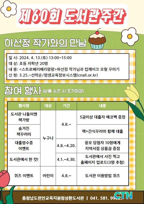 [õ¾È/CTN]°Çö¼ö ±âÀÚ = ÃæÃ»³²µµÃµ¾È±³À°Áö¿øÃ»¼ºÈ¯µµ¼°ü(°üÀå ¹®Á¤¼÷)Àº 4¿ù 1ÀÏ(¿ù)ºÎÅÍ 4¿ù 30ÀÏ(È)±îÁö Á¦60ȸ µµ¼°üÁÖ°£ Çà»ç¸¦ ¿î¿µÇÑ´Ù°í ¹àÇû´Ù.