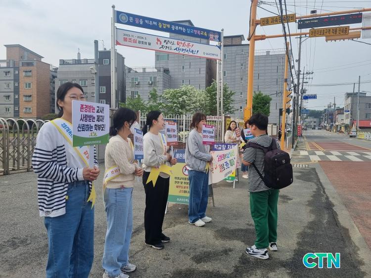 Çкθðȸ¿¡¼´Â Çö¼ö¸·, ÆÖ¸» µîÀ» ÀÚü Á¦ÀÛÇϰí ÁغñÇÏ¿© ¡®±³±ÇÀÌ º¸È£µÇ¾î¾ß ±³»ç¿Í ÇлýÀÌ ´ÙÇÔ²² ÇູÇÕ´Ï´Ù.¡¯, ¡®½º½Â Á¸°æ ÇÏ´Ãó·³!, Á¦ÀÚ »ç¶û ¹Ù´Ùó·³!¡¯ µî ±¸È£¸¦ ¿ÜÄ¡¸ç 1½Ã°£ 30ºÐ µ¿¾È Ä·ÆäÀÎÀ» ¹ú¿´´Ù. ±³±Çº¸È£ÀÇ Á߿伺¿¡ ´ëÇØ Çлýµé°ú Áö¿ª ÁֹΠ¸ðµÎ ÇѸ¶À½, ÇѶæÀ¸·Î ¸¶À½ ¼Ó ±íÀÌ °ø°¨ÇÏ¸ç ´Ù°°ÀÌ µ¿ÂüÇϱ⸦ ¹Ù¶ó´Â Çкθð´ÔµéÀÇ ¶æÀ» ´ã¾Æ ÁøÇàÇß´Ù.