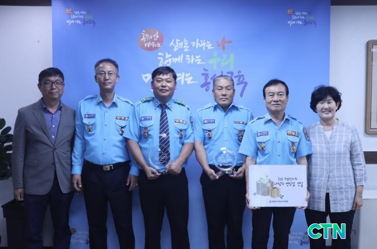 [È«¼º/CTN]ÇѼºÁø ±âÀÚ = È«¼º±³À°Áö¿øÃ»(±³À°Àå ÀÌÁ¤¼ø)Àº 2ÀÏ 2Ãþ ±³À°Àå½Ç¿¡¼ ¾ÈÀüÇÑ ±³ÅëÁú¼ È®¸³°ú µî±·±æ ¾ÈÀü ¹®È È®»êÀ» À§ÇØ ³ë·ÂÇÑ È«¼º±º ¸ð¹ü¿îÀüÀÚȸ(ȸÀå ±è¿ëÅÂ)¿¡°Ô 500ÀåÀÇ Àå°©°ú °¨»çÆÐ¸¦ Àü´ÞÇß´Ù°í ¹àÇû´Ù.