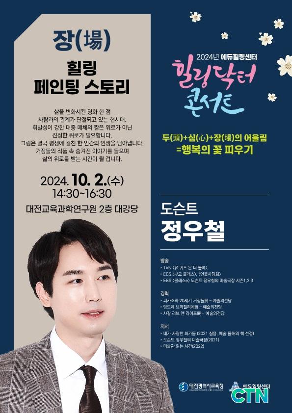 Èú¸µ´ÚÅÍ ÄܼƮ´Â ´ëÀü °ü³» ±³Á÷¿øÀ» ´ë»óÀ¸·Î ÇÏ´Â °¿¬À̸ç, ¡®µÎ(Ôé)+½É(ãý)+Àå(íÞ)ÀÇ ¾î¿ï¸²=ÇູÀÇ ²É ÇÇ¿ì±â¡¯¶ó´Â ´ëÁÖÁ¦ ¾Æ·¡ µÎ(Ôé)-ÇູÀº ³ú¾È¿¡ ÀÖ´Ù, ½É(ãý)-ºÒ¾ÈÇÏ°í ºÒÈ®½ÇÇÑ ½Ã´ë¿¡ Çູ ã±â, Àå(íÞ)-Èú¸µ ÆäÀÎÆÃ ½ºÅ丮, ¾î¿ï¸²-¸¶À½ ¿¡³ÊÁö ÅëÀåÀÇ ¹ýÄ¢À̶ó´Â ¼ÒÁÖÁ¦·Î °¿¬À» ÅëÇØ Àϻ󿡼 ¸¶À½À» µ¹º¸´Â Çб³¹®È¿Í °¡Á¤¹®È¸¦ ¸¸µé¾î °¡°í ÀÖ´Ù.