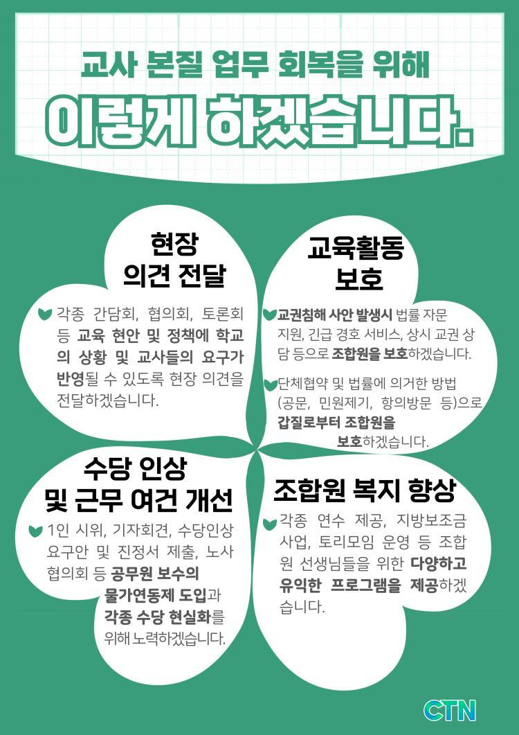 ±è¿¹Áö À§¿øÀå Èĺ¸¿Í Á¤¾Ö¸® ¼ö¼®ºÎÀ§¿øÀå È帴 ¡®±³À° ÇöÀåÀÌ ¹Ù²ð ¼ö ÀÖ´Ù´Â Èñ¸ÁÀ» Çö½Ç·Î ¸¸µé°Ú½À´Ï´Ù¡¯¶ó´Â ºñÀü°ú ÇÔ²² ¡¤¡ã±³¿øÀÇ Á¤´çÇÑ ±³À°È°µ¿ º¸È£ ¡ã±³¿øÀÇ º»Áú ¾÷¹« ȸº¹ ¡ã±³¿ø ÁöÀ§ Çâ»ó°ú ±³±Ç ȸº¹ ¡ã±³¿øÀÇ º¹¸®ÈÄ»ý ÁõÁø ¡ãÇб³ ±Ù¹« ¿©°Ç °³¼± ¡ãÇб³ ÇöÀåÀÇ ÀÇ°ß Àü´Þ ¡ã´Üü±³¼· ü°á·Î Á¶ÇÕ¿ø º¸È£ ¡ãÁ¶ÇÕ¿ø ÇýÅà Ȯ´ë µîÀÇ ³»¿ëÀ» °ø¾àÀ¸·Î ¹ßÇ¥Çß´Ù