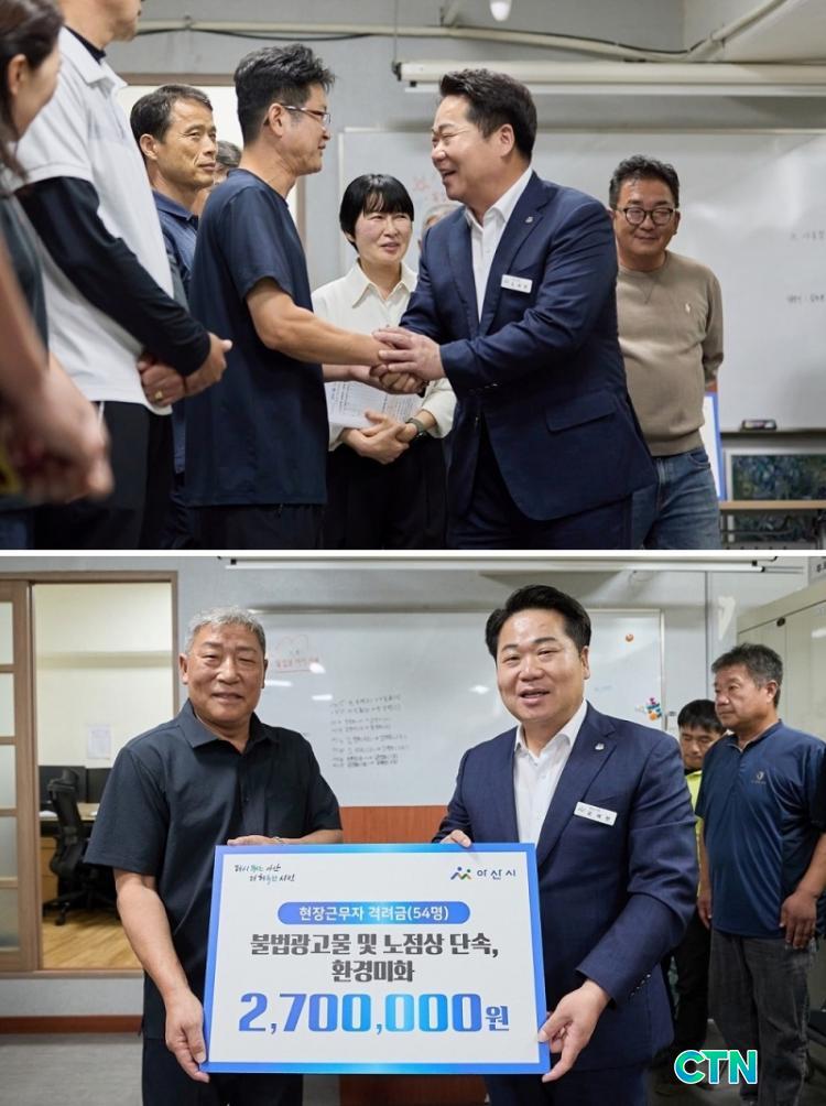 ¿À ½ÃÀåÀº À̳¯ ȯ°æ¹ÌÈ¿ø »ç¹«½ÇÀ» Á÷Á¢ ¹æ¹®ÇØ Á÷¿ø 54¸í¿¡°Ô ¾Æ»ê»ç¶û»óǰ±ÇÀ» °Ý·Á±ÝÀ¸·Î Àü´ÞÇßÀ¸¸ç, ³ª¸ÓÁö 13°³ ºÎ¼ 83¸í¿¡ ´ëÇØ¼´Â °¢ ºÎ¼ÀåÀ» ÅëÇØ Àü´ÞÇß´Ù.