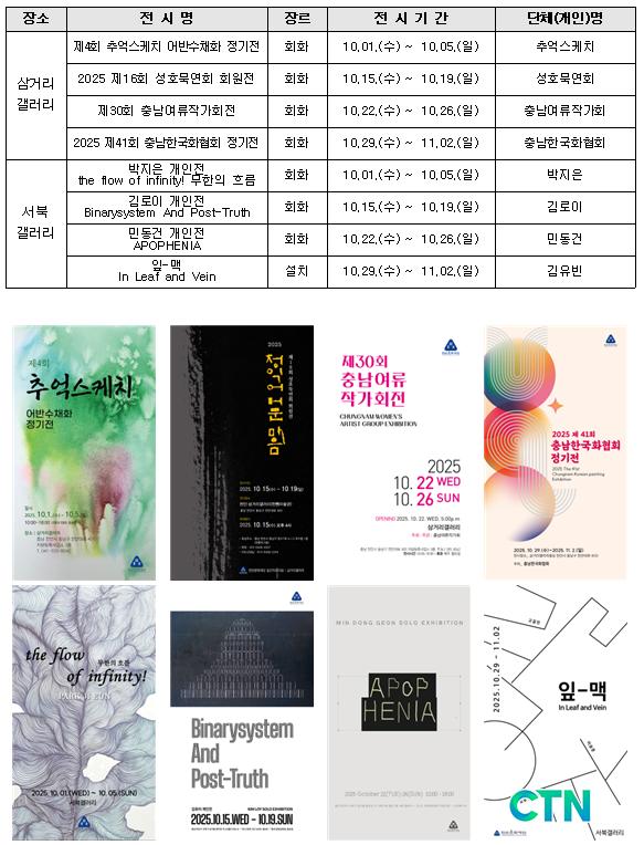 »ï°Å¸® °¶·¯¸®¿¡¼´Â ¡ã10¿ù 1~ 5ÀÏ, Á¦4ȸ Ã߾コÄÉÄ¡ ¾î¹Ý¼öÃ¤È Á¤±âÀü ¡ã10¿ù 15~ 19ÀÏ, 2025 Á¦16ȸ ¼ºÈ£¹¬¿¬È¸ ȸ¿øÀü ¡ã10¿ù 22~ 26ÀÏ, Á¦30ȸ Ãæ³²¿©·ùÀÛ°¡È¸Àü ¡ã10¿ù 29ÀÏ~ 11¿ù 2ÀÏ, 2025 Á¦41ȸ Ãæ³²Çѱ¹ÈÇùȸ Á¤±âÀüÀÌ ¿¸°´Ù.