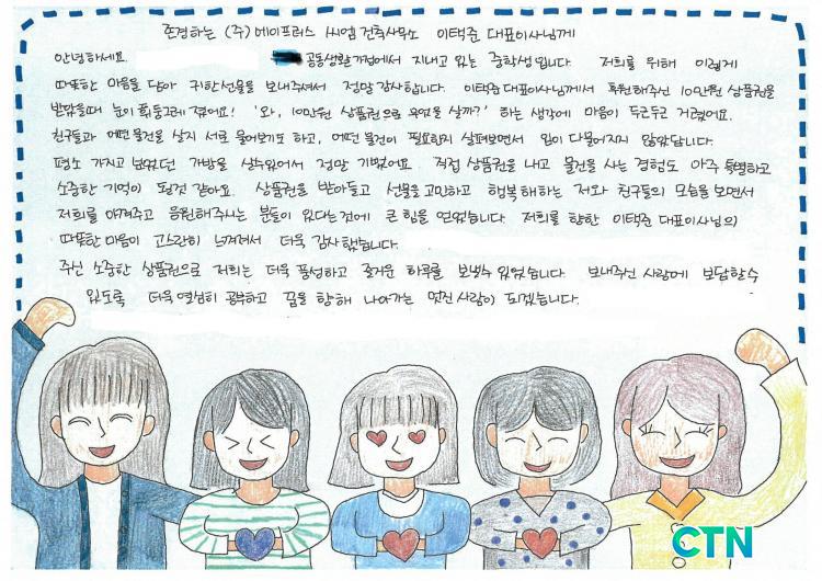 »óǰ±ÇÀ» Àü´Þ¹ÞÀº ÇÑ ÇлýÀº ¡°°®°í ½Í¾úÁö¸¸ ¸¶À½¿¡¸¸ µÎ°í ÀÖ¾ú´ø ¹°°ÇÀ» »óǰ±ÇÀ¸·Î »ì ¼ö ÀÖ°Ô µÆ´Ù¡±¸ç ¡°Àúµµ Ä¿¼ ÁÁÀº ¾î¸¥ÀÌ µÇ¾î ´Ù¸¥ »ç¶÷ÀÇ ¸¶À½À» ÀÌÇØÇÏ°í µ½´Â »ç¶÷ÀÌ µÇ°í ½Í´Ù¡±´Â ³»¿ëÀÇ ÆíÁö¸¦ ÈÄ¿øÀÚ¿¡°Ô ÀüÇß´Ù.