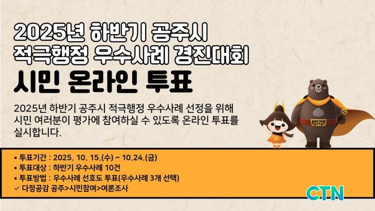 [°øÁÖ/CTN]ÀÌÀºÃá ±âÀÚ = °øÁÖ½Ã(½ÃÀå ÃÖ¿øÃ¶)´Â ¿ÃÇØ ÇϹݱâ Àû±ØÇàÁ¤ ¿ì¼ö»ç·Ê ¼±Á¤À» À§ÇØ ½Ã¹ÎÀ» ´ë»óÀ¸·Î ÇÑ ¿Â¶óÀÎ ÅõÇ¥¸¦ 10¿ù 15ÀϺÎÅÍ 24ÀϱîÁö ½Ç½ÃÇÑ´Ù°í ¹àÇû´Ù.