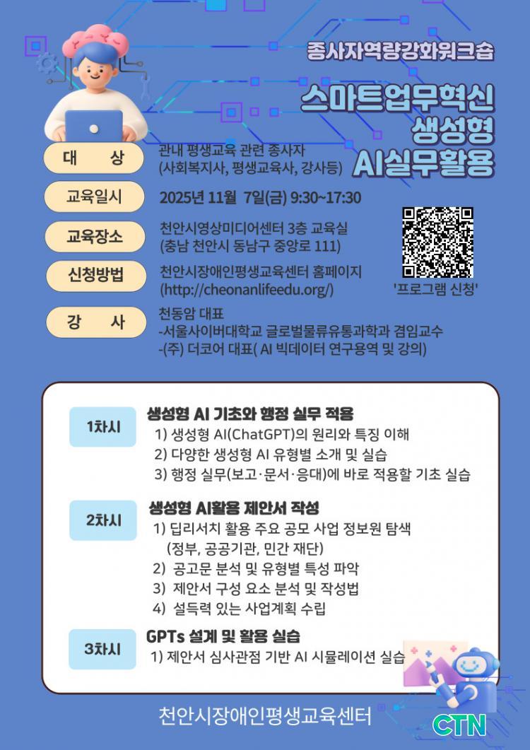 [õ¾È/CTN] °Çö¼ö ±âÀÚ = õ¾È½ÃÀå¾ÖÀÎÆò»ý±³À°¼¾ÅÍ´Â °ü³» Æò»ý±³À° Á¾»çÀÚµéÀÇ ¾÷¹« È¿À²¼º ÁõÁø°ú Àü¹®¼º Çâ»óÀ» À§ÇØ ¡®½º¸¶Æ® ¾÷¹« Çõ½Å°ú »ý¼ºÇü AI ½Ç¹«È°¿ë¡¯ ¿ª·® °È ¿öÅ©¼óÀ» ¿À´Â 11¿ù 7ÀÏ(±Ý) °³ÃÖÇÑ´Ù°í ¹àÇû´Ù.