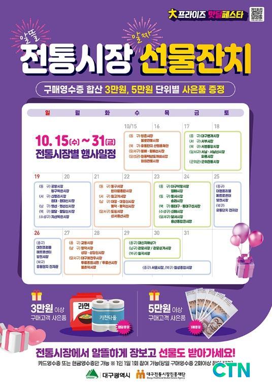 [´ë±¸/CTN]À̼öÇö ±âÀÚ= ´ë±¸±¤¿ª½Ã´Â 10¿ù 15ÀϺÎÅÍ 31ÀϱîÁö Áö¿ª ³» ÀüÅë½ÃÀå 77°÷¿¡¼ 'ÀüÅë½ÃÀå Ȱ·ÂUP! ¼ÒºñUP! °í°´¸ÂÀÌ Æ¯º° »çÀºÇà»ç'¸¦ ÁøÇàÇÑ´Ù°í ¹àÇû´Ù.