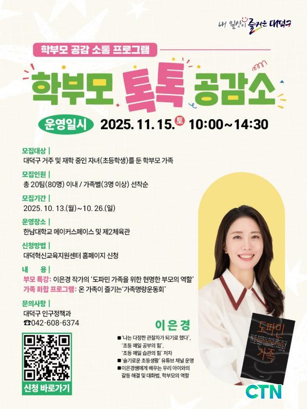 ´ëÀü ´ë´ö±¸´Â ¿À´Â 11¿ù 15ÀÏ ´ëÀü ¸ð ´ëÇп¡¼ Çкθð¿Í Àڳడ ÇÔ²² Âü¿©ÇÏ´Â °ø°¨ ¼ÒÅë ÇÁ·Î±×·¥ ¡®Çкθð ÅåÅå °ø°¨¼Ò¡¯¸¦ ¿î¿µÇÑ´Ù°í ¹àÇû´Ù.