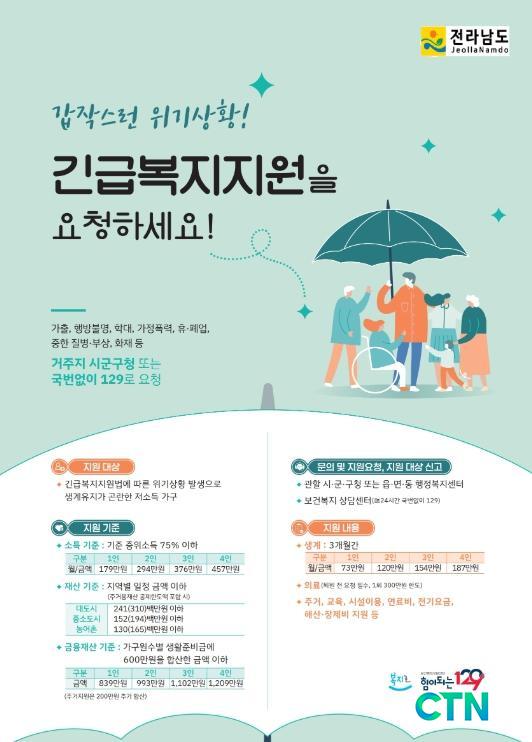 [Àü³²/CTN]Çϼº¸Å ±âÀÚ= Àü¶ó³²µµ´Â ÁÖ ¼ÒµæÀÚ ½ÇÁ÷¡¤Áúº´ µî °©ÀÛ½º·¯¿î À§±â»óȲ¿¡ óÇÑ °¡±¸°¡ ¹ß»ýÇßÀ» ¶§ ½Å¼ÓÇÑ Áö¿øÀ» À§ÇÑ '±ä±Þº¹Áö Áö¿ø' »ç¾÷ºñ ±¹ºñ 17¾ï ¿øÀ» Ãß°¡·Î È®º¸Çß´Ù°í ¹àÇû´Ù.