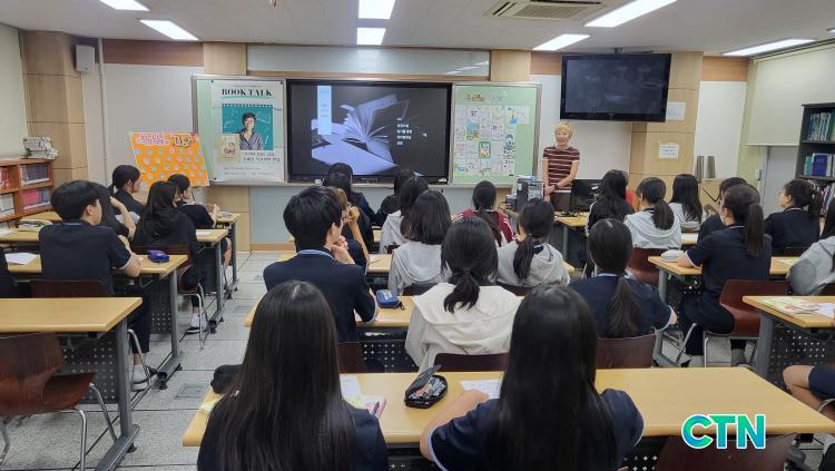 ¡®¼Ö¶óÀÇ Á¤¿ø¡¯ ±èÇýÁ¤ ÀÛ°¡°¡ õ¾ÈÁö¿ª Çб³¿¡ ¹æ¹®ÇØ Ã»¼Ò³âµé°ú ¼ÒÅëÇϰí ÀÖ´Ù.