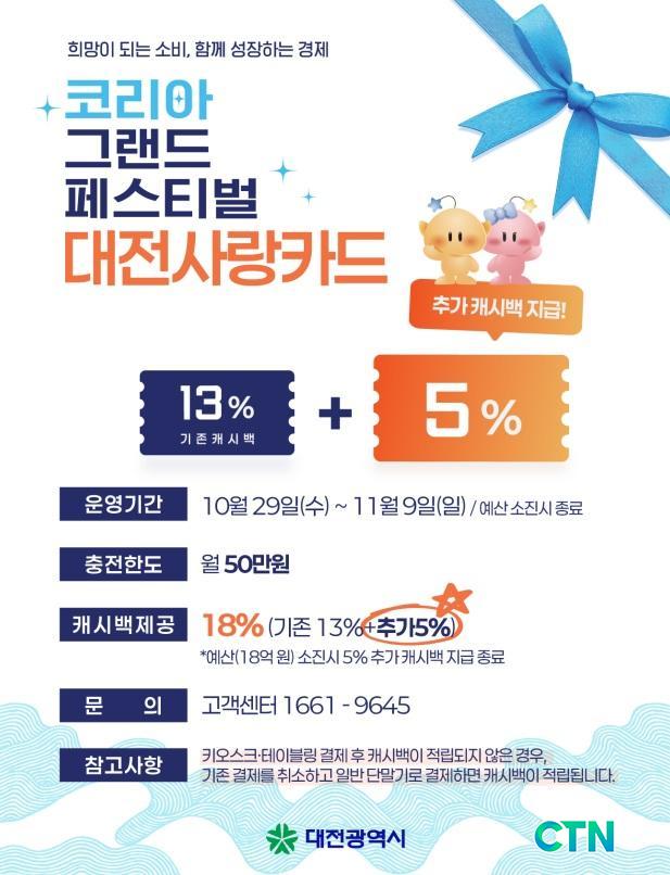 [´ëÀü/CTN]Á¤¹ÎÁØ ±âÀÚ¤Ó´ëÀü½Ã´Â 29ÀϺÎÅÍ 11¿ù 9ÀϱîÁö 12ÀÏ µ¿¾È ÁøÇàµÇ´Â ¡®2025ÄÚ¸®¾Æ ±×·£µå Æä½ºÆ¼¹ú¡¯¿¡ ¸ÂÃç ´ëÀü»ç¶ûÄ«µå 18% Ưº° ÇÒÀÎ À̺¥Æ®¸¦ ÃßÁøÇÑ´Ù.