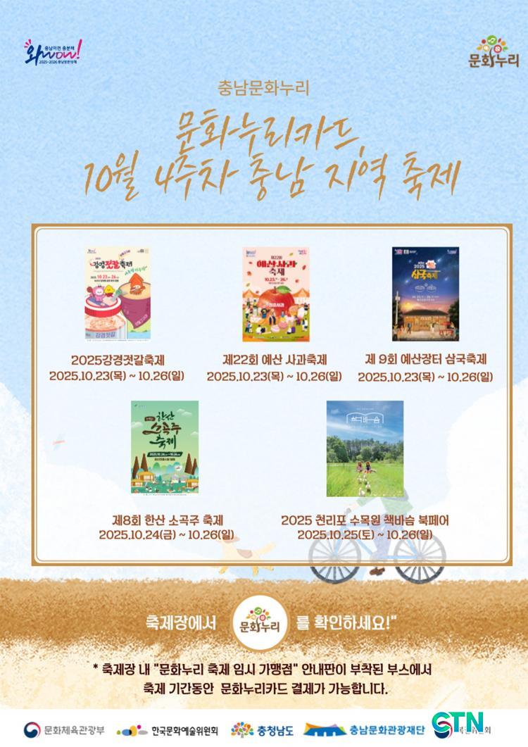 ÃàÁ¦ ÇöÀå¿¡¼ ¹®È´©¸®Ä«µå ¾È³»ÆÇÀÌ ºÎÂøµÈ ºÎ½º¿¡¼ üÇè°ú Ư»ê¹° ±¸¸Å°¡ °¡´ÉÇÏ´Ù. 10¿ù 4ÁÖÂ÷ ¹®È´©¸®Ä«µå »ç¿ëÀÌ °¡´ÉÇÑ Ãæ³² Áö¿ª ÃàÁ¦·Î´Â ¡ã2025 °°æÁ£°¥ÃàÁ¦(10.23.~10.26) ¡ãÁ¦22ȸ ¿¹»ê»ç°úÃàÁ¦(10.23.~10.26) ¡ãÁ¦9ȸ ¿¹»êÀåÅͻﱹÃàÁ¦(10.23.~10.26) ¡ãÁ¦8ȸ ÇÑ»ê¼Ò°îÁÖÃàÁ¦ (10.24.~10.26) ¡ãõ¸®Æ÷¼ö¸ñ¿ø Ã¥¹Ù½¿ ºÏÆä¾î (10.25.~10.26)µîÀÌ ÀÖ´Ù.