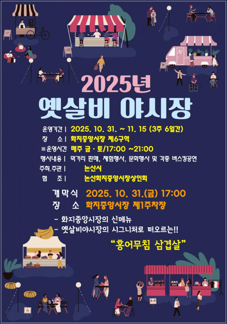³í»ê½Ã(½ÃÀå ¹é¼ºÇö)´Â ¿À´Â 31ÀÏ ¿ÀÈÄ 5½Ã ÈÁöÁß¾Ó½ÃÀå Á¦1ÁÖÂ÷Àå¿¡¼ ¡®2025 ¿¾»ìºñ ¾ß½ÃÀ塯 °³¸·½ÄÀ» ¿°í, 11¿ù 15ÀϱîÁö ¸ÅÁÖ ±Ý¡¤Åä¿äÀÏ Àú³á ¾ß½ÃÀåÀ» ¿î¿µÇÑ´Ù.
