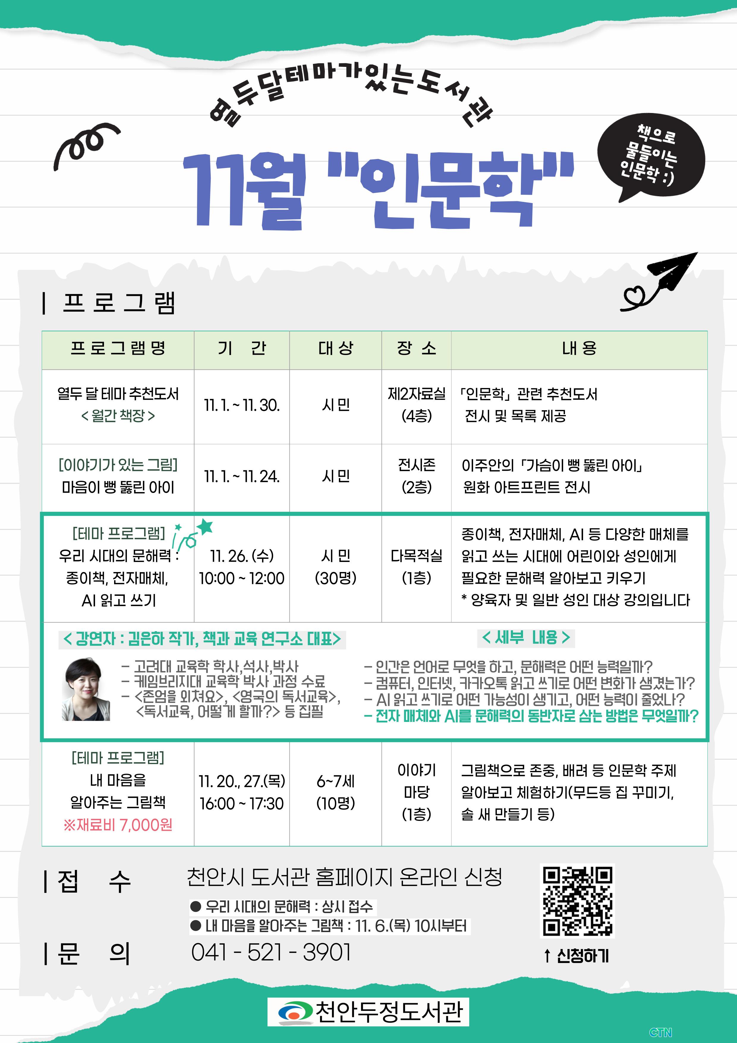 - ¿À´Â 11¿ù 26ÀÏ¿¡´Â ¼ºÀÎÀ» ´ë»óÀ¸·Î ÇÑ Àι®ÇÐ °¿¬ **¡®¿ì¸® ½Ã´ëÀÇ ¹®Çط¡¯**ÀÌ ÁøÇàµÇ¸ç,