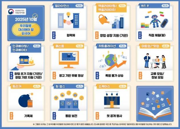¹®Ã¼ºÎ¿Í ±¹¾î¿øÀº 2025³â 10¿ù ±¹¾î½ÉÀÇȸ ±¹¾î¼øÈºÐ°úÀ§ ½ÉÀÇ¡¤ÀǰáÀ» °ÅÃÄ '¾ó¶óÀ̾ð½º', '¾×¼¿·¯·¹ÀÌÆÃ/¾×¼¿·¯·¹ÀÌÅÍ', 'ÇÚÁî ¿Â' µîÀÇ ¿Ü·¡ ¿ë¾î¸¦ °¢°¢ 'Çù·Âü', 'â¾÷ ¼ºÀå Áö¿ø/â¾÷ ¼ºÀå Áö¿ø ±â°ü', 'Á÷Á¢ üÇè(Çü)' µîÀ¸·Î ¹Ù²Ù¾î ¾²±â·Î Çß´Ù.