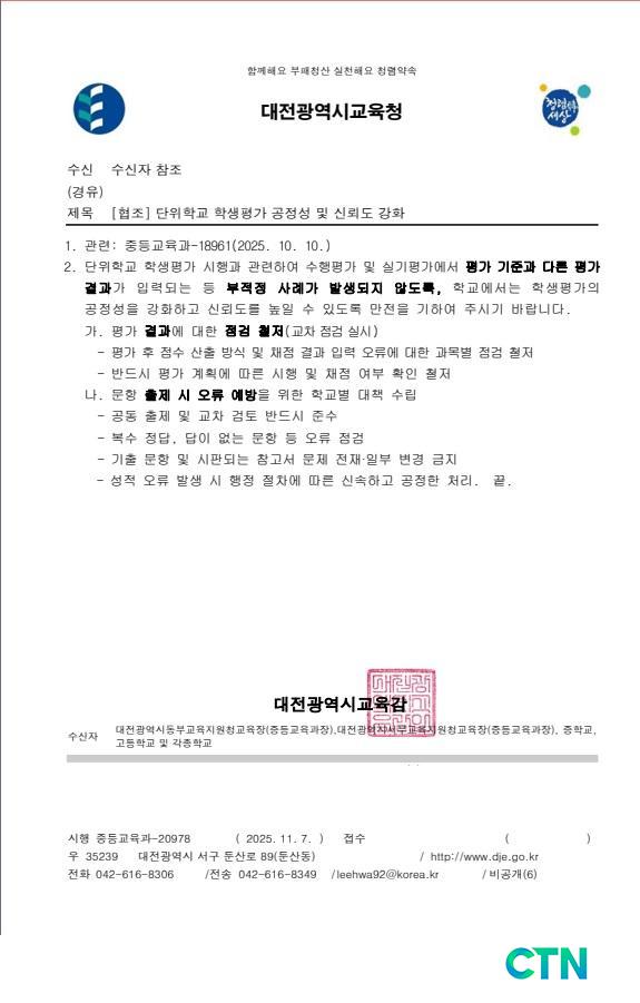 [´ëÀü/CTN]Á¤¹ÎÁØ ±âÀÚ¤Ó´ëÀü½Ã±³À°Ã»Àº 7ÀÏ ´ÜÀ§Çб³ÀÇ ¼öÇàÆò°¡ ¹× ½Ç±âÆò°¡ °ü·Ã °øÁ¤¼ºÀ» °ÈÅä·Ï Àü Çб³¿¡ ±ä±Þ ¾È³»Çß´Ù°í ¹àÇû´Ù.