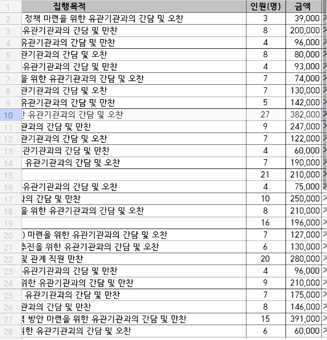 CTN º»Áö°¡ ÀÔ¼öÇÑ ±è±âÀ± ±Ý»ê±ºÀÇÀåÀÇ 8~9¿ù ¾÷¹«ÃßÁøºñ ³»¿ªÀ» ºÐ¼®ÇÑ °á°ú, µÎ ´Þ°£ ÃÑ 7,674,000¿øÀÌ ´ëºÎºÐ ¡®°£´ãȸ¡¯ ¸í¸ñÀÇ ½Ä»ç ÀÚ¸®¿¡ ¾²ÀÎ °ÍÀ¸·Î È®ÀεƴÙ. ¸íºÐÀº Á¤Ã¥ ³íÀÇ¿´Áö¸¸, ½Ç»óÀº ¹ä»ó À§¿¡¼ ¼¼±ÝÀÌ »ç¶óÁ³´Ù.