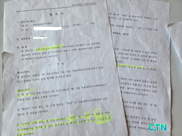 CTNÀÌ 5ÀÏ ¼¿ï´ëÄ¡°úº´¿ø °í°´Áö¿øÆÀÀå°úÀÇ ÅëÈ¿¡¼ ¹Ý·ÐÀ» ¿äûÇÏÀÚ, ¡°ÇØ´ç ÇÕÀǼ´Â Ç¥ÁØ ¾ç½ÄÀÌ ¾Æ´Ï¶ó °³º° »ç¾È¿¡ ¸ÂÃç ÀÛ¼ºµÈ °ÍÀ¸·Î, ¹ý·ü ÀÚ¹®À» °ÅÃÄ »ç¿ëÇß´Ù. ȯÀÚ Ãø µ¿ÀÇ ¾øÀÌ ÀÛ¼ºµÈ °ÍÀº ¾Æ´Ï´Ù.¡±¶ó°í ÇØ¸íÇß´Ù.